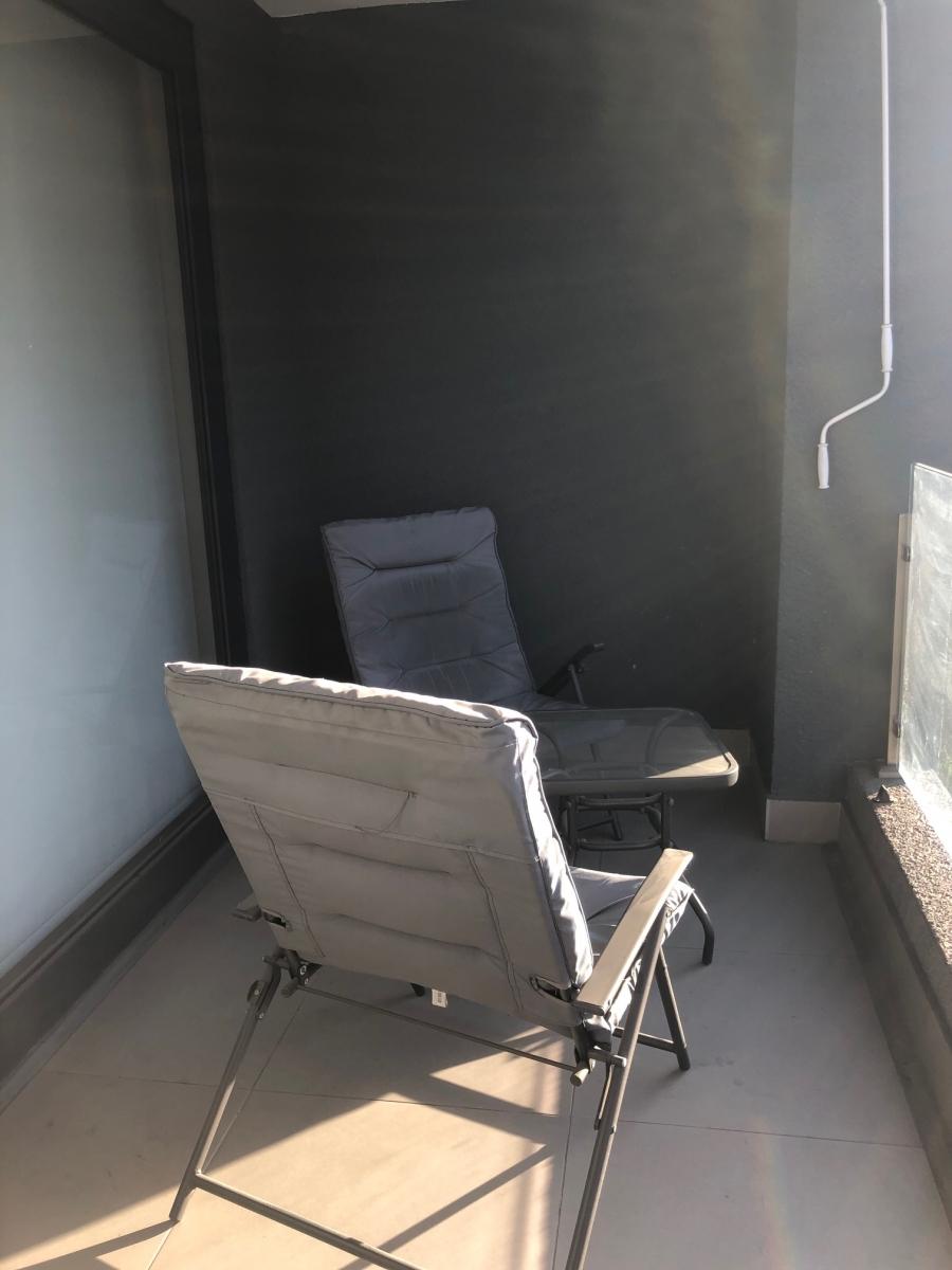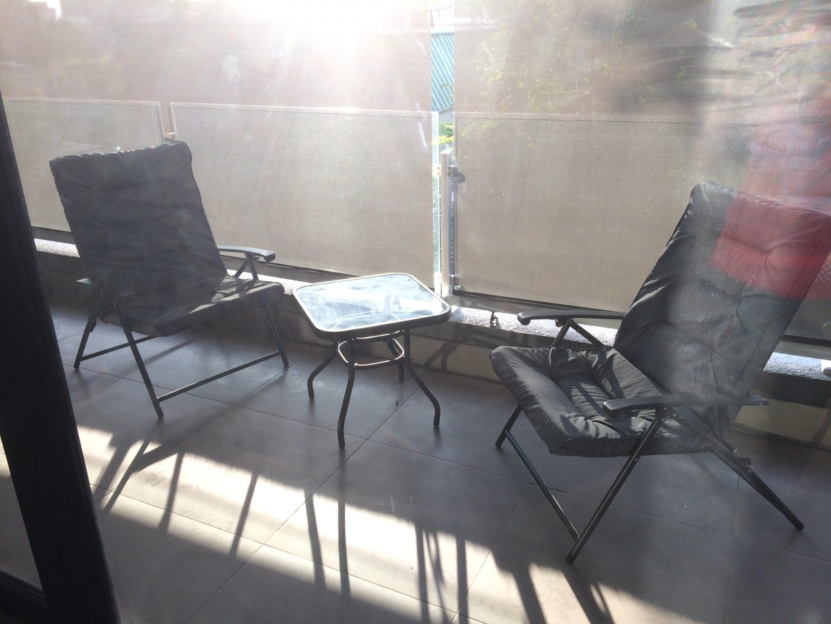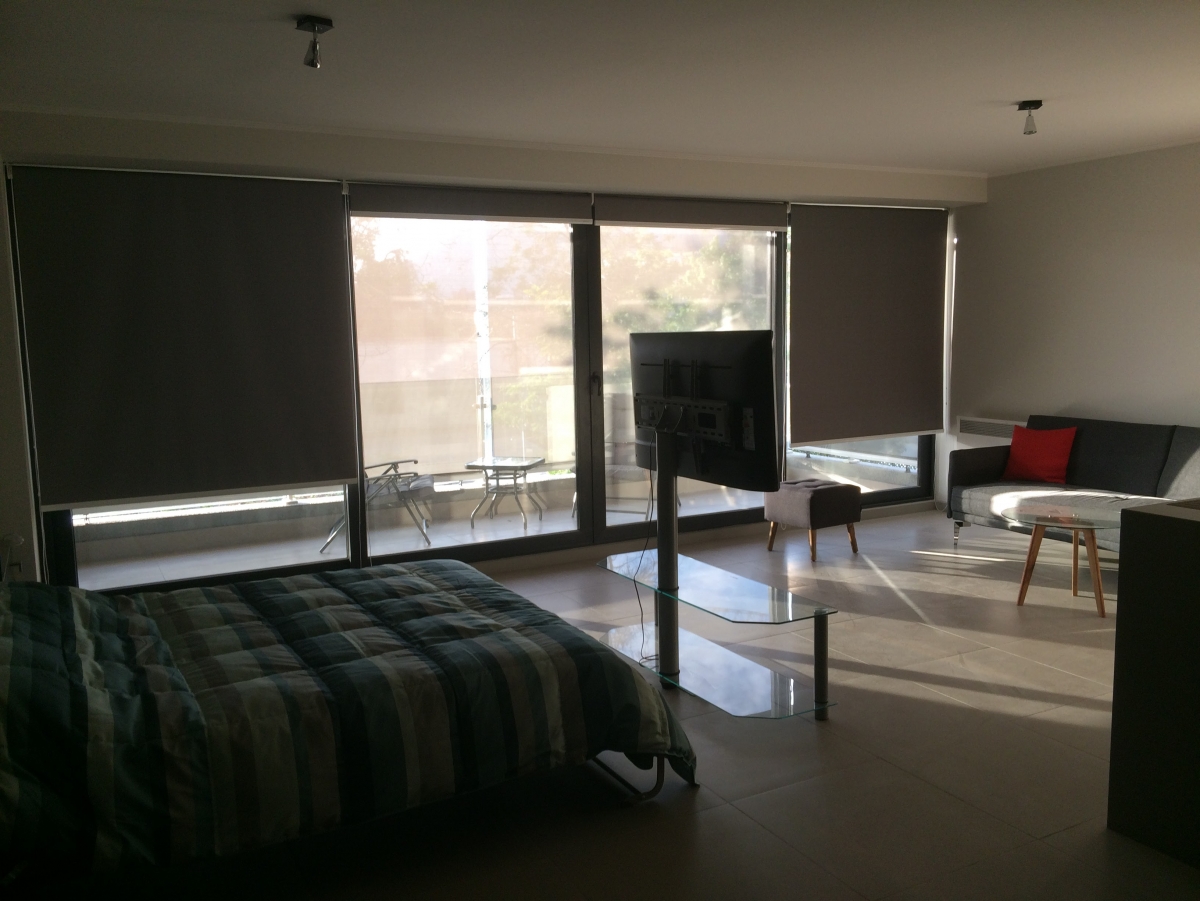 Amplio balcón de 12 mts con reposeras y cortinas exteriores de roller.